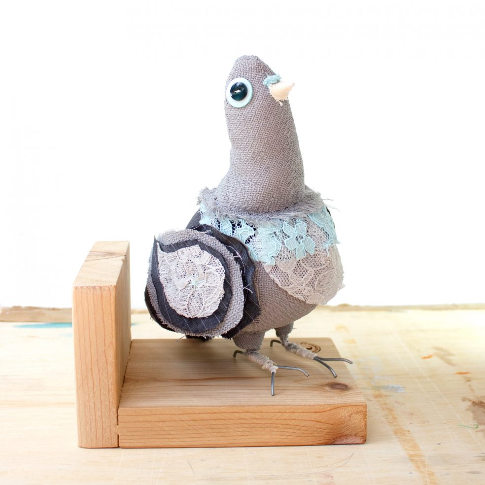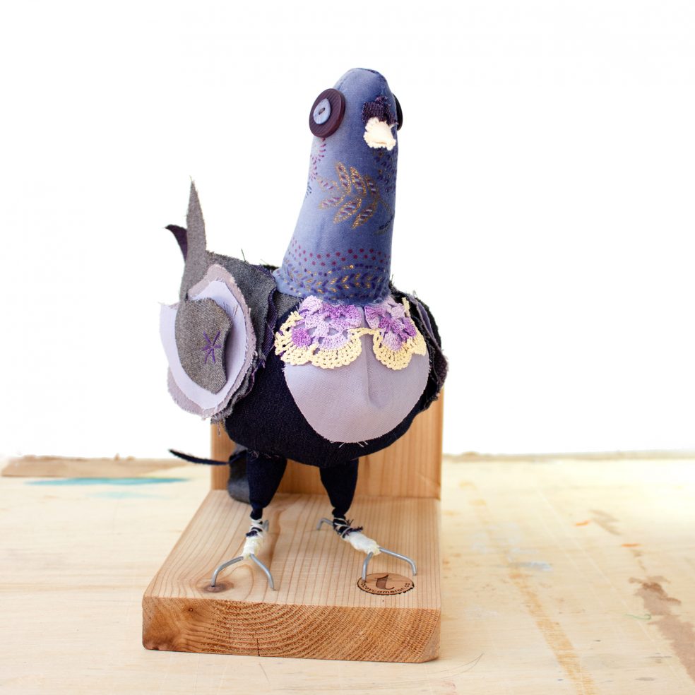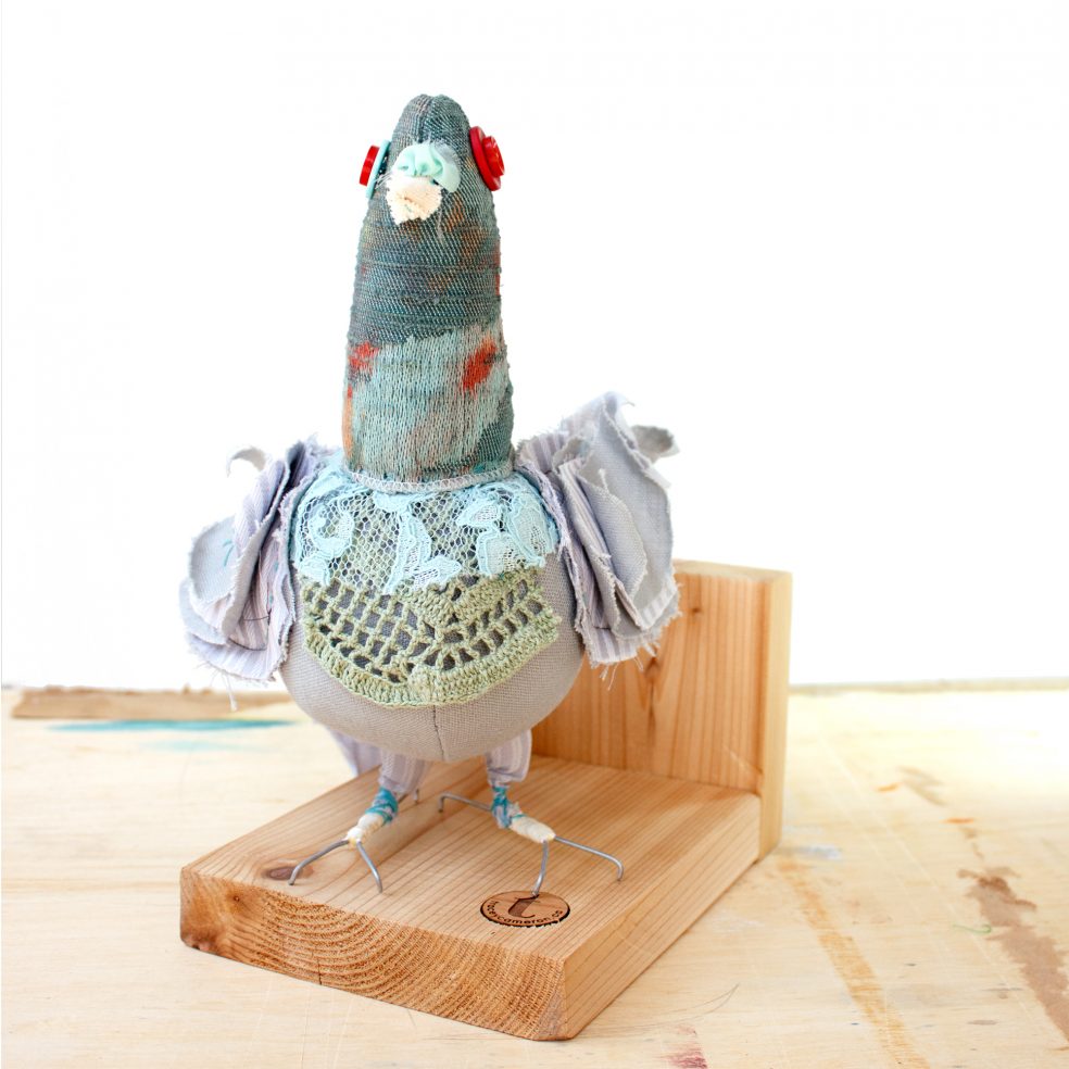 This handcrafted soft sculpture celebrates the beauty of the humble rock pigeon and all it’s many color variations. While pigeons are often thought of as pests, their stubborn nature actually symbolizes determination and the ability to overcome whatever obstacles lie in a person’s path. Let this humble creature remind you to keep moving forward no matter what others may assume about you.