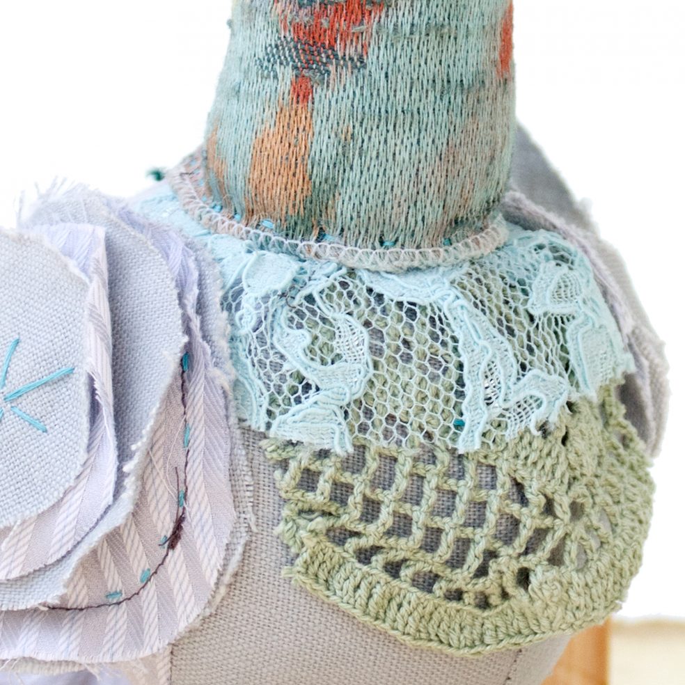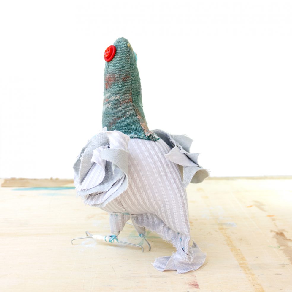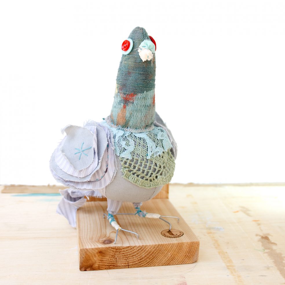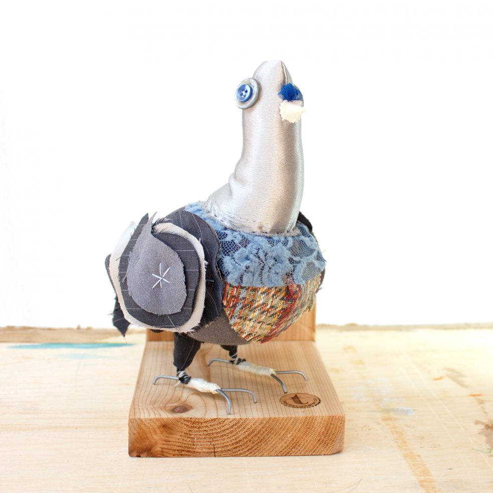 This handcrafted soft sculpture celebrates the beauty of the humble rock pigeon and all it’s many color variations. While pigeons are often thought of as pests, their stubborn nature actually symbolizes determination and the ability to overcome whatever obstacles lie in a person’s path. Let this humble creature remind you to keep moving forward no matter what others may assume about you.